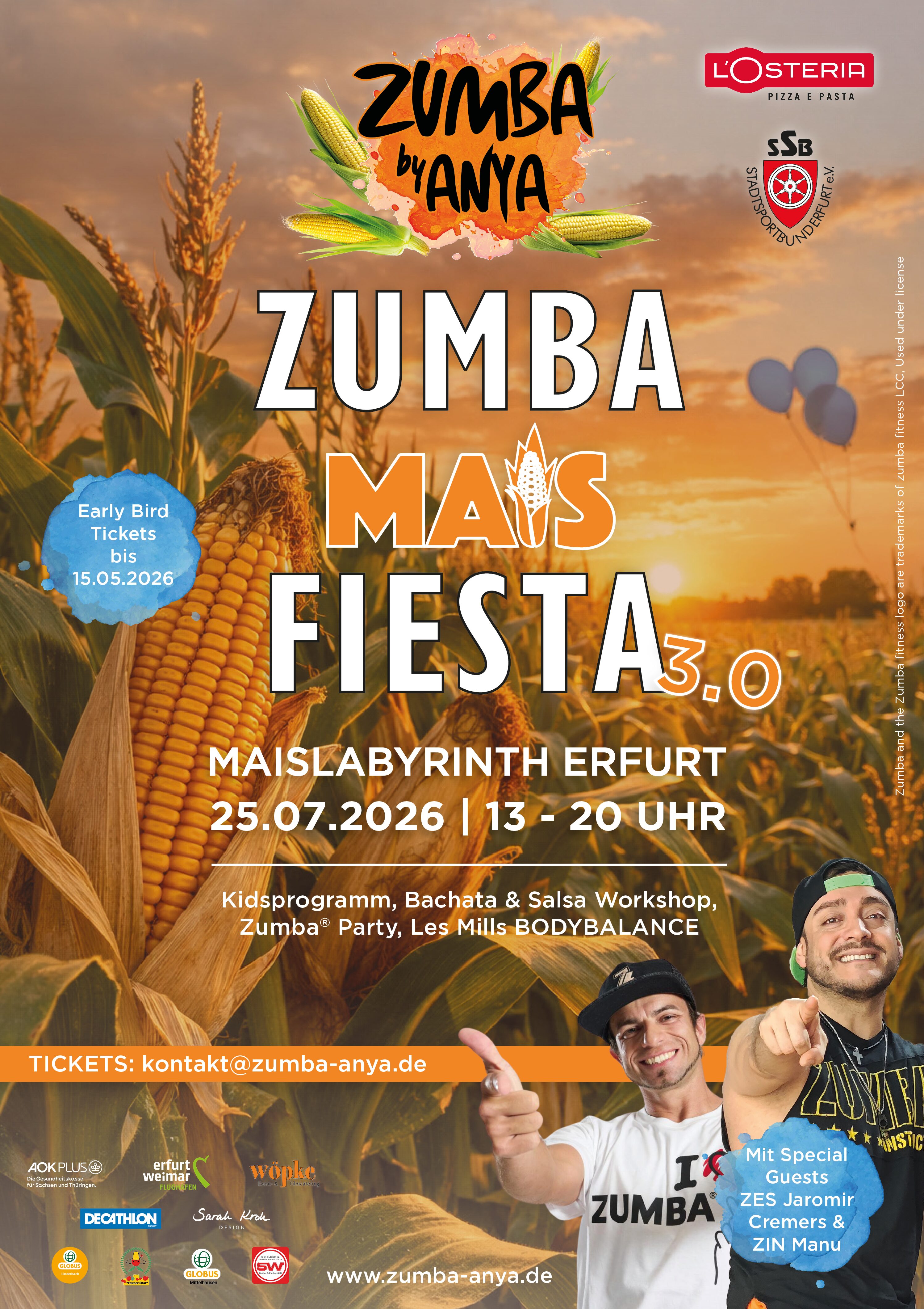 Die Zumba Mais Fiesta 3.0 ist das Zumba Event Erfurt! Im Erfurter Maislabyrinth erwarten dich Kinder-Mitmachaktionen, ein Bachata/ Salsa Workshop mit Special Guests aus den Niederlanden und Chile, 2 Stunden Zumba Party und zum Ausklang eine Stunde Les Mills Body Balance. Erlebe ein energiegeladenes Zumba Open Air voller Rhythmus, Bewegung und Lebensfreude mitten in der Natur.